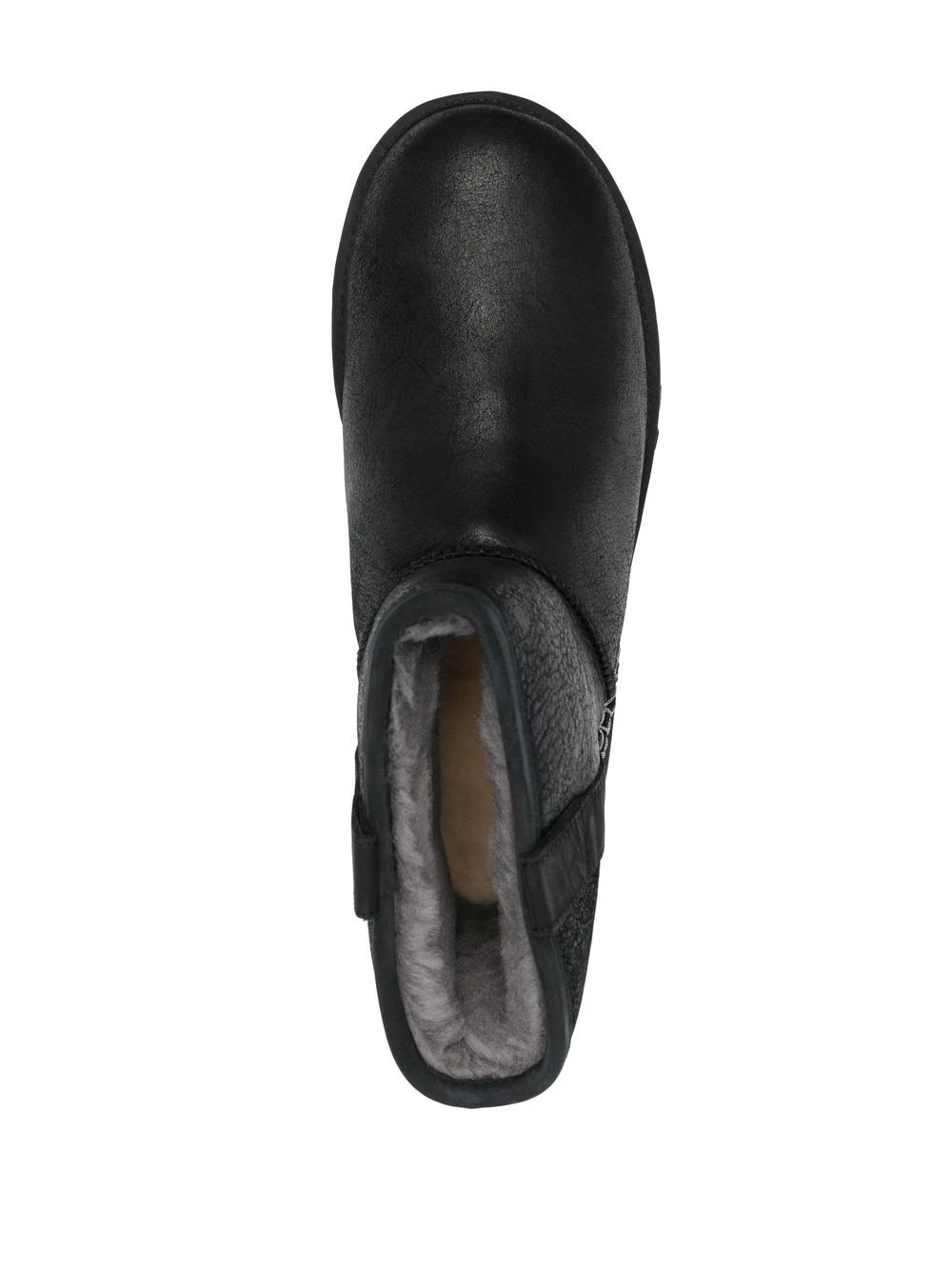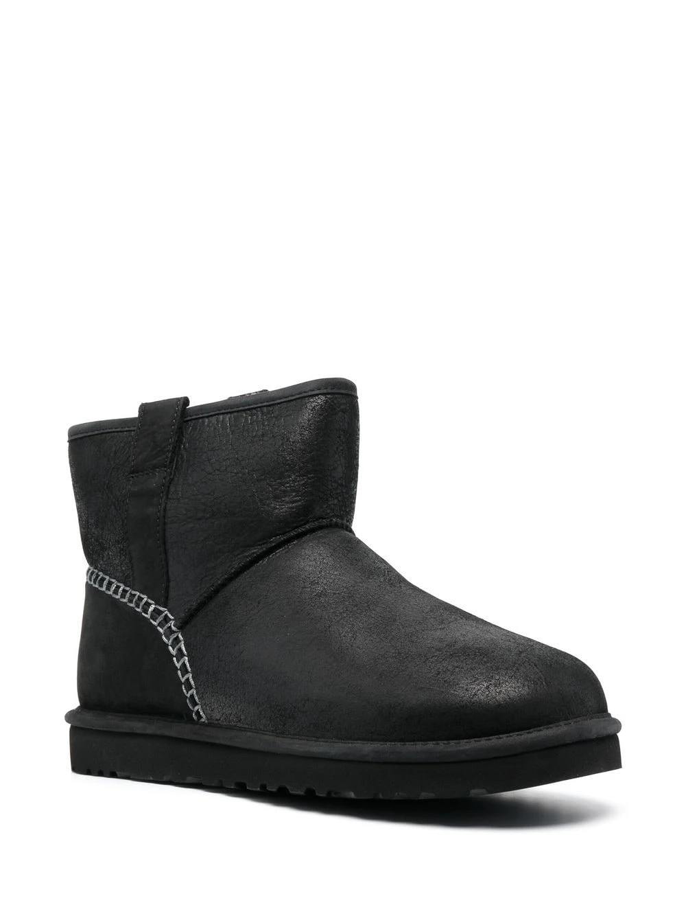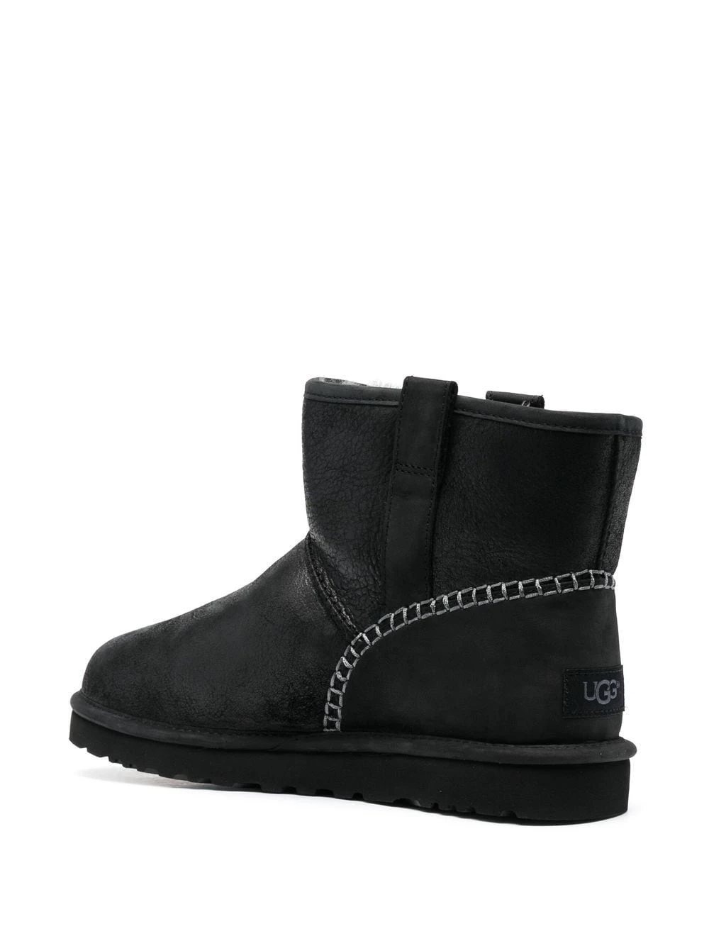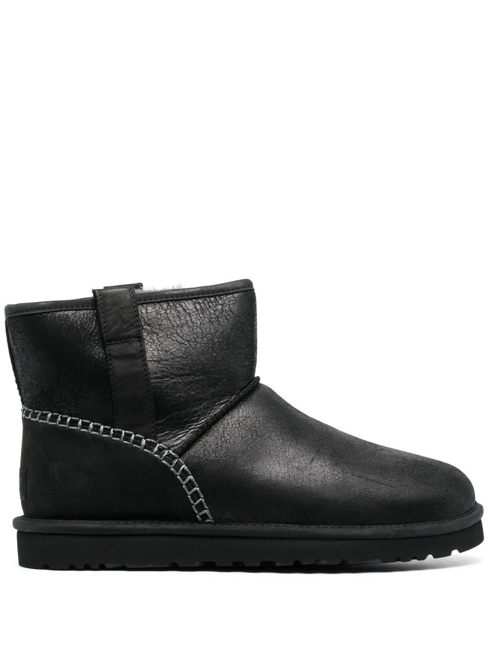 Classic Mini Stitch boots from UGG featuring black, calf leather, logo patch to the rear, contrast stitching, water-resistant, double pull-tab at the opening, round toe, flat rubber sole, ankle-length and UGGpureâ„¢ wool lining.