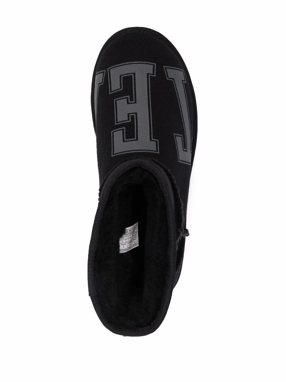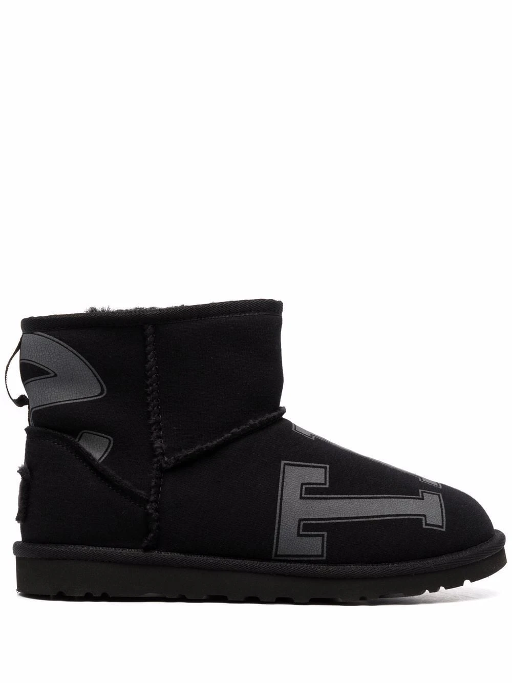 Black x Telfar Fleece Mini boots from UGG featuring logo print to the front, logo patch to the rear, exposed-seam detailing, cushioned insole, pull-tab at the heel, ankle-length, slip-on style, UGGplushâ„¢ lining and Treadlite by UGGâ„¢ sole.