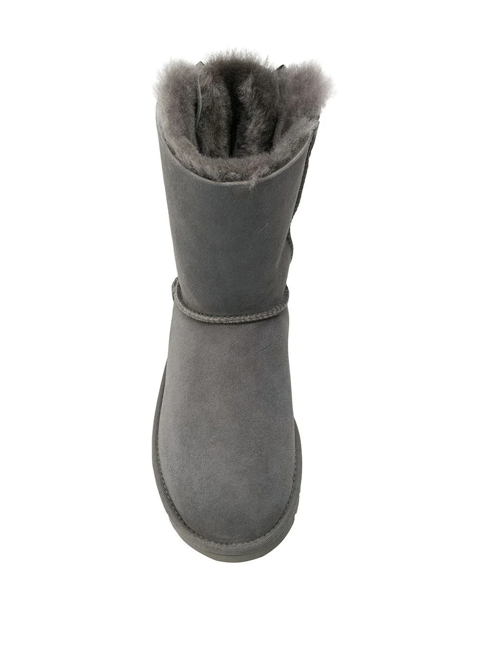 Dark grey suede and lamb fur Bailey Bow II ankle boots from UGG featuring a shearling lining, a bow detail, a round toe, a slip-on style, an ankle length and a flat rubber sole.