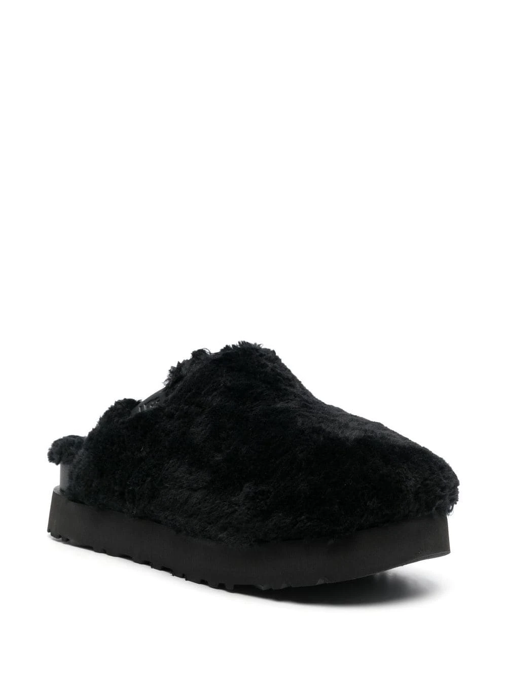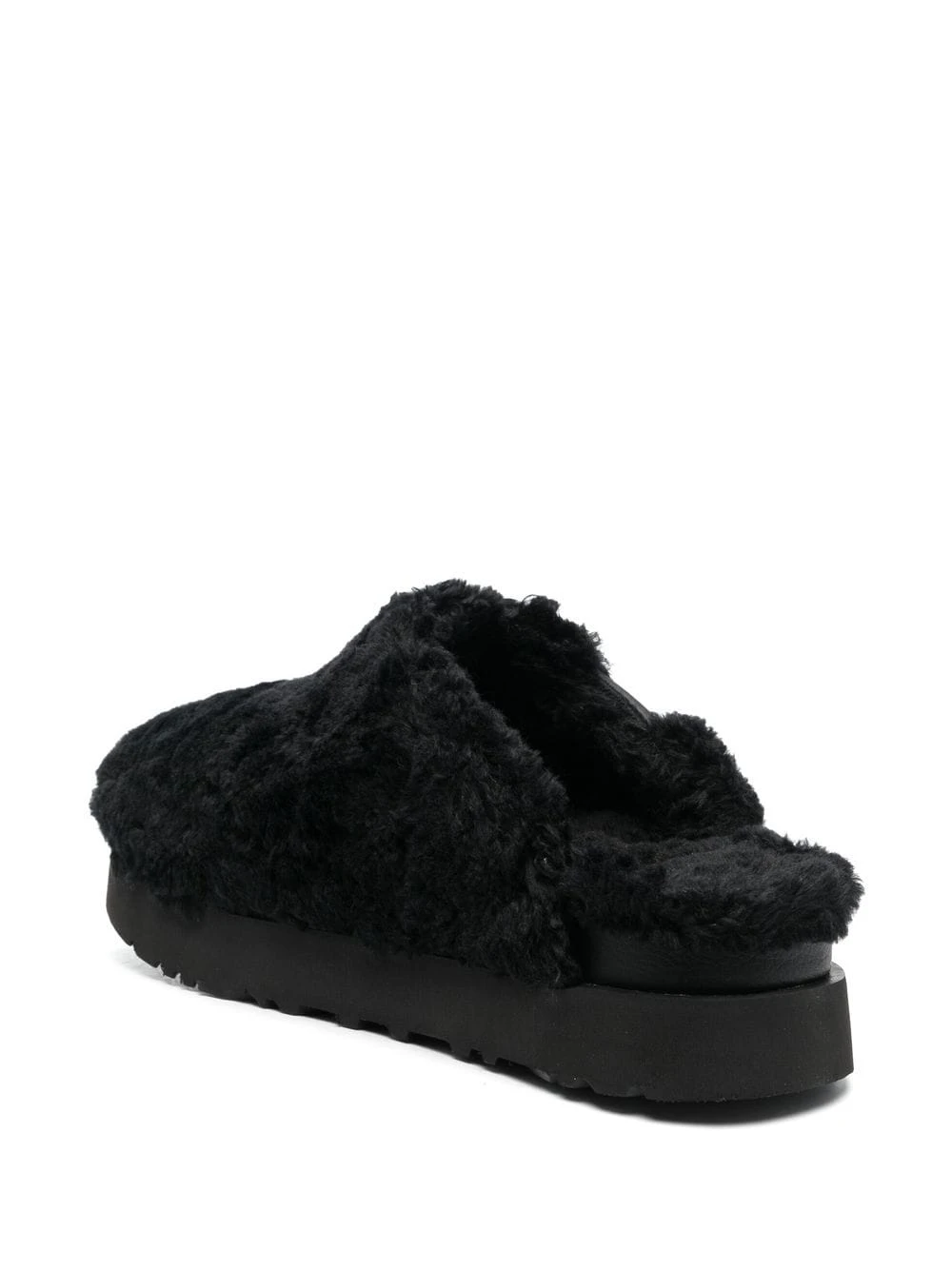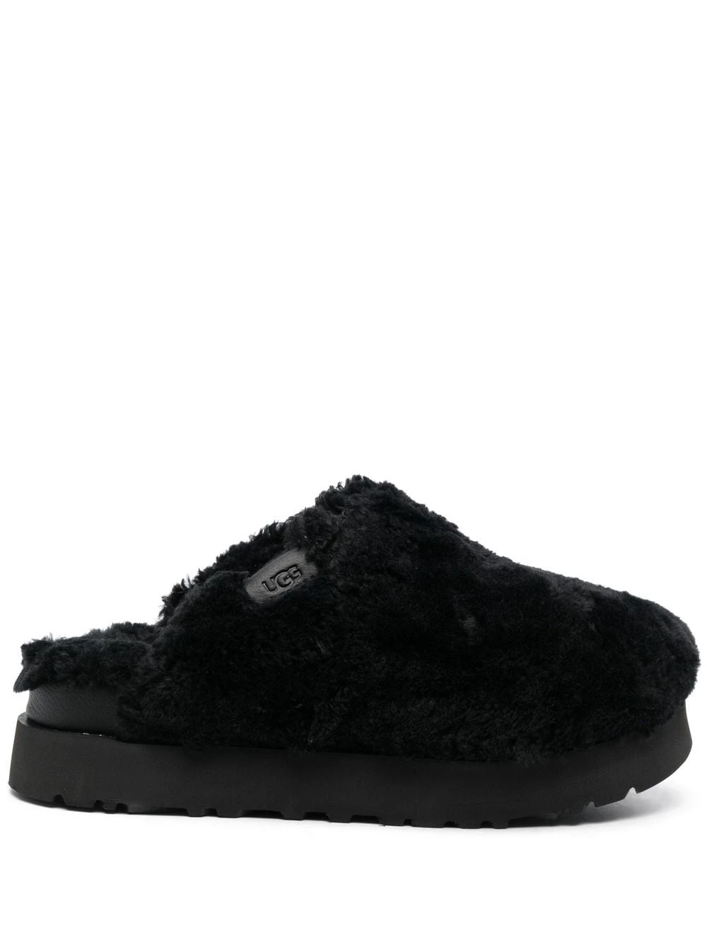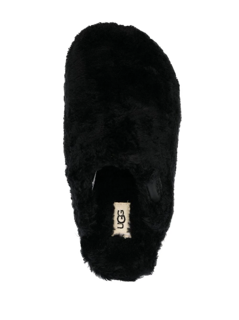 Fuzz Sugar Slide slippers from UGG featuring jet black, faux-shearling design, logo patch to the side, branded insole, round toe, slip-on style and flatform sole.
