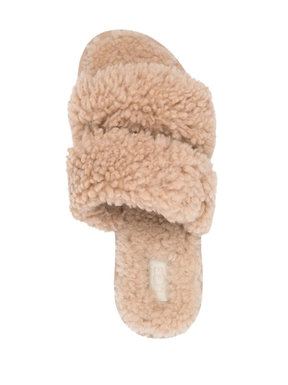 Maxi Curly Scuffette slippers from UGG featuring sand beige, sheepskin, open toe, full lining, flat rubber sole, slip-on style and double-strap design.